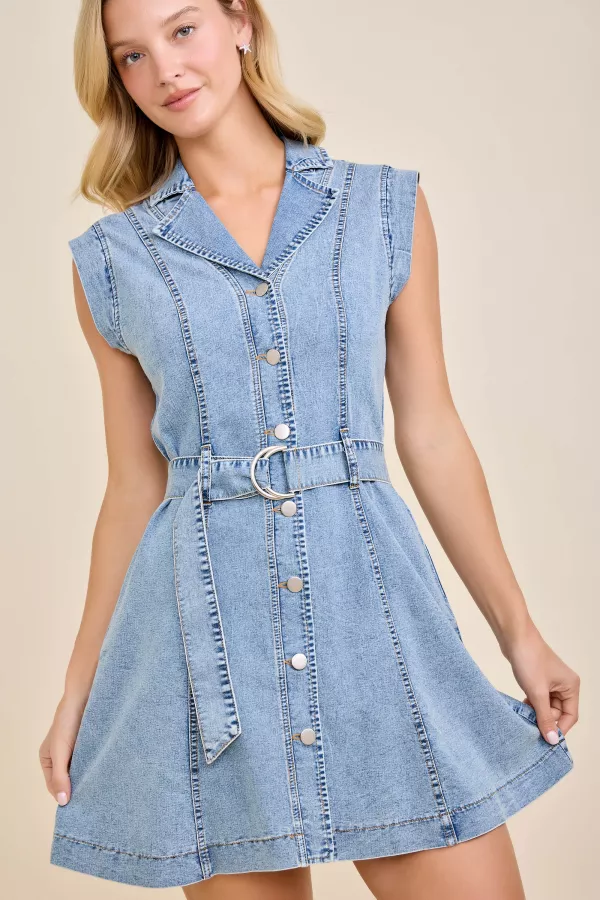 A polished denim mini dress featuring a tailored collar, snap-button front, and a matching belt that shapes the waist beautifully. The soft denim and paneled seams create a flattering A-line silhouette that’s easy for everyday wear. Perfect for spring styling, weekend looks, or boutique bestsellers. denim mini dress, belted dress, button front dress, sleeveless denim dress, A-line denim dress, casual denim style, spring dress, summer dress, boutique bestseller, snap button dress, women’s denim dress, weekend outfit, ready to ship, ships fast, in-stock favorites, main strip