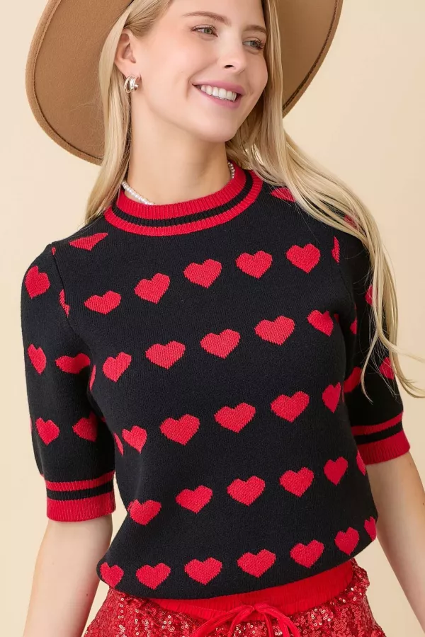 Chic yet playful, this knit top features an all-over red heart pattern with striped neckline and cuffs. Slim fit with short sleeves makes it easy to style with skirts, denim, or festive bottoms. A versatile Valentine's Day knit that transitions seamlessly into spring casual looks. heart stripe knit, valentine sweater top, black and red knitwear, festive knit top, chic valentine sweater, cute casual knit, red heart pullover, spring knit fashion