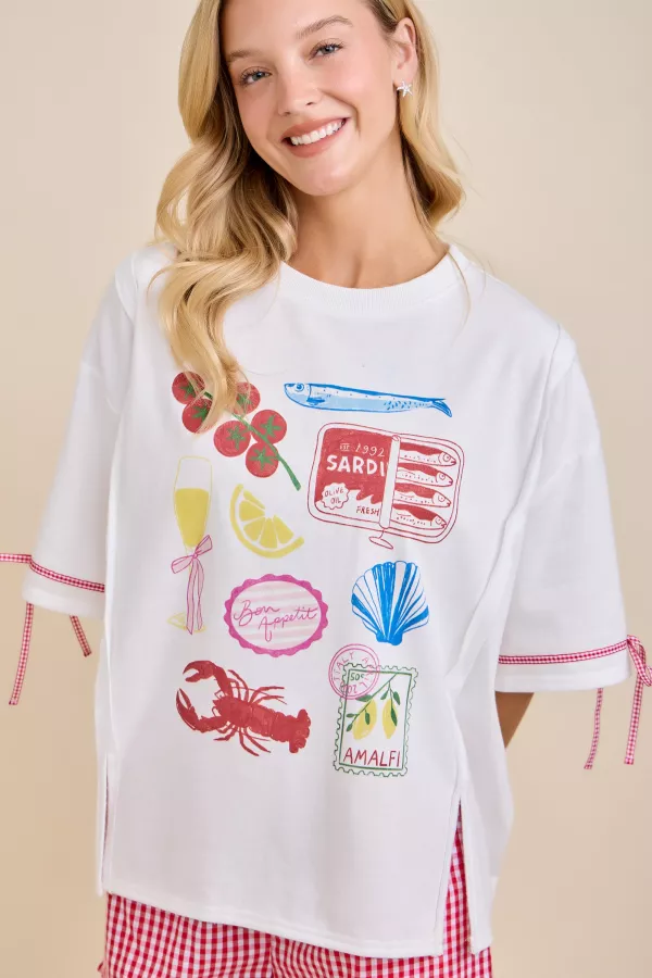 Vintage-inspired graphic tee featuring playful European food illustrations including sardines, seafood, citrus, and Amalfi postcard art. Designed with a relaxed fit and soft feel, making it an easy everyday statement piece for Southern and gift-focused boutiques. Perfect for customers who love unique graphics, coastal charm, and effortless casual styling. Pairs perfectly with denim, skirts, or layered looks year-round. Soft & comfortable fabric Relaxed, easy fit Eye-catching food & coastal illustrations Great giftable graphic tee for boutique shoppers Southern Boutique Apparel, vintage graphic tee, sardine graphic shirt, European food art tee, coastal inspired top, novelty graphic tee, casual boutique top, giftable graphic shirt, relaxed fit tee, unique southern style