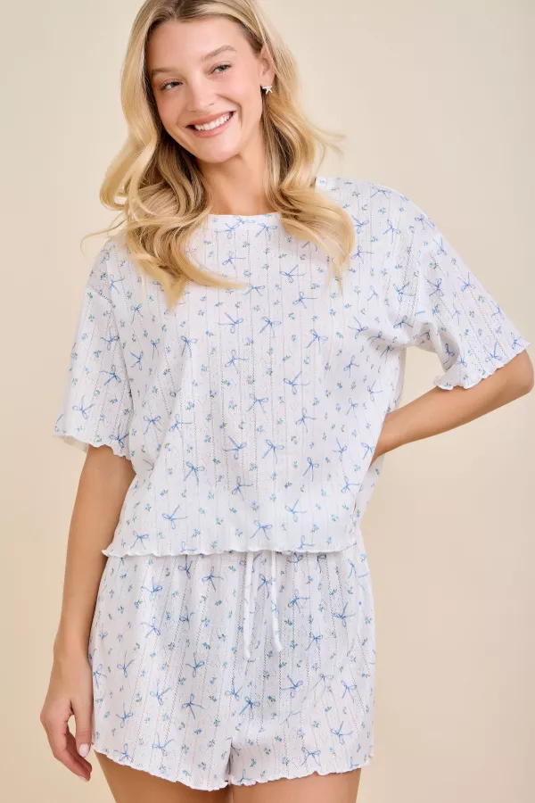 Soft rib-knit lounge set featuring a sweet bow and mini floral print, scalloped lettuce hems, and a relaxed silhouette for all-day comfort. Lightweight and breathable, perfect for cozy spring days, weekend lounging, or cute sleepwear. Feminine, comfy, and easy to wear as an everyday matching set. ready to ship, ships fast, in-stock favorites, lounge set, rib knit set, pajama set, bow print, floral print, cute loungewear, soft knit set, cozy matching set, comfy shorts set, lettuce hem top, homewear, girly lounge outfit, spring loungewear, soft daily wear, main strip
