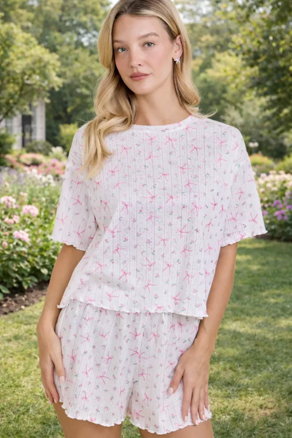 Soft rib-knit lounge set featuring a sweet bow and mini floral print, scalloped lettuce hems, and a relaxed silhouette for all-day comfort. Lightweight and breathable, perfect for cozy spring days, weekend lounging, or cute sleepwear. Feminine, comfy, and easy to wear as an everyday matching set. ready to ship, ships fast, in-stock favorites, lounge set, rib knit set, pajama set, bow print, floral print, cute loungewear, soft knit set, cozy matching set, comfy shorts set, lettuce hem top, homewear, girly lounge outfit, spring loungewear, soft daily wear, main strip