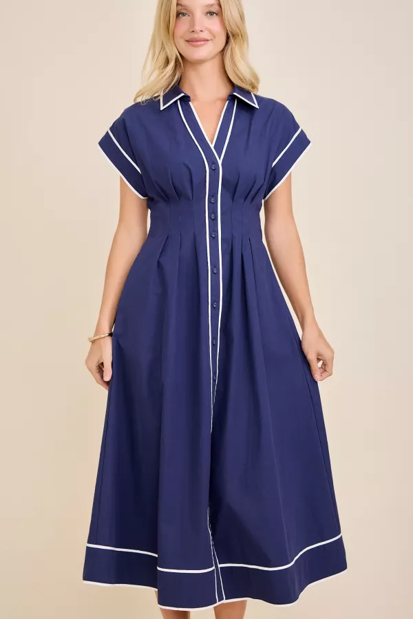 Elegant shirt-style midi dress with button down front, contrasting piping trim, and elastic waist. Perfect spring & summer day dress. Shirt Dress, Midi Dress, Button Down Dress, Light Blue Dress, White Trim Dress, Collared Dress, Casual Spring Dress, Summer Midi, Picnic Outfit, Resort Wear, Daytime Dress, Work Casual Dress, Retro Inspired Dress, Classic Blue Dress, Feminine Chic