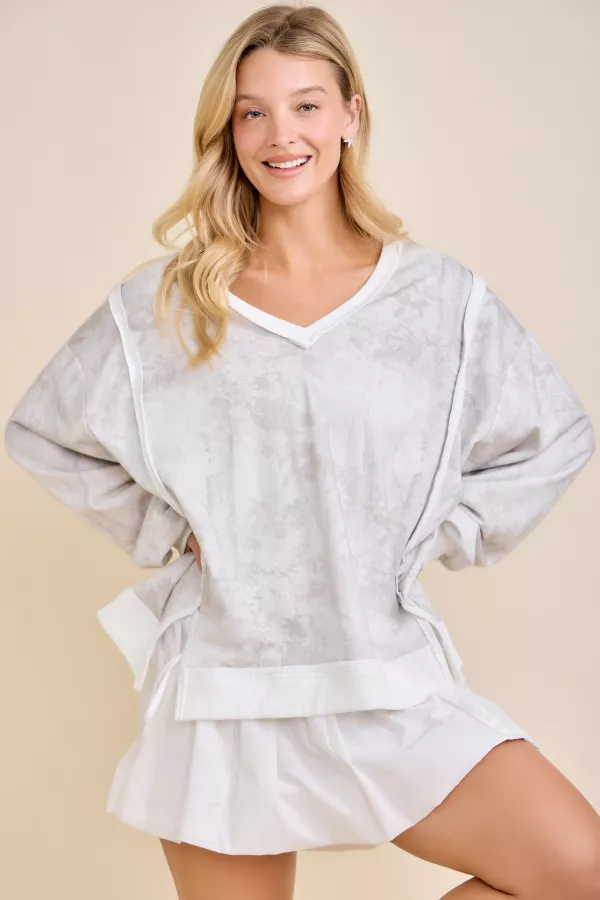 Camo wood print V-neck long sleeve oversized top 50%COTTON 50%POLYESTER