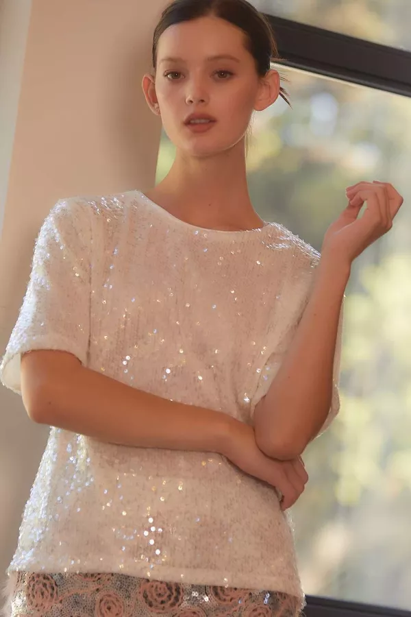 Shine effortlessly in this classic short sleeve sequin top. Available in black and ivory, it's perfect for layering with jeans, skirts, or tailored pants. A versatile piece that transitions easily from casual chic daytime looks to glamorous party nights. Sequin Top, Party Top, Holiday Outfit, Sparkly Top, Short Sleeve Sequin Shirt, NYE Outfit, Glam Top, Clubwear, Evening Style, Festival Fashion