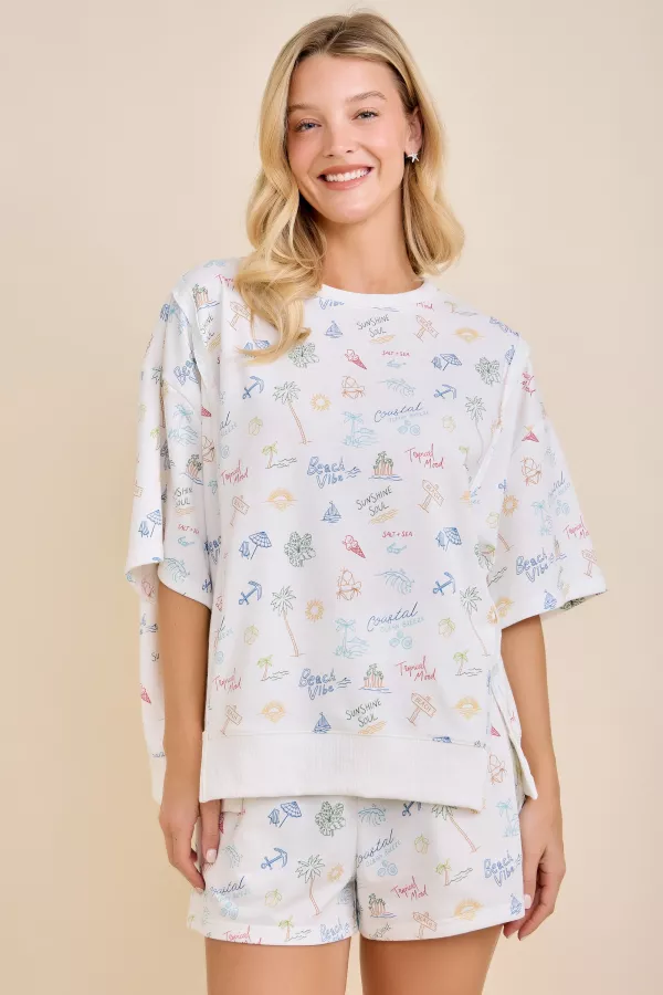 Relaxed lounge set featuring a soft pullover sweatshirt and matching elastic-waist shorts. Allover coastal doodle print with beach icons and fun phrases for an easy, laid-back vibe. Perfect for vacations, weekend wear, travel days, and gifting. lounge set, sweatshirt shorts set, matching set, beach print set, coastal print set, vacation set, travel outfit, weekend set, elastic waist shorts, comfy set, resort wear, graphic lounge set, boutique set, Southern Boutique Apparel