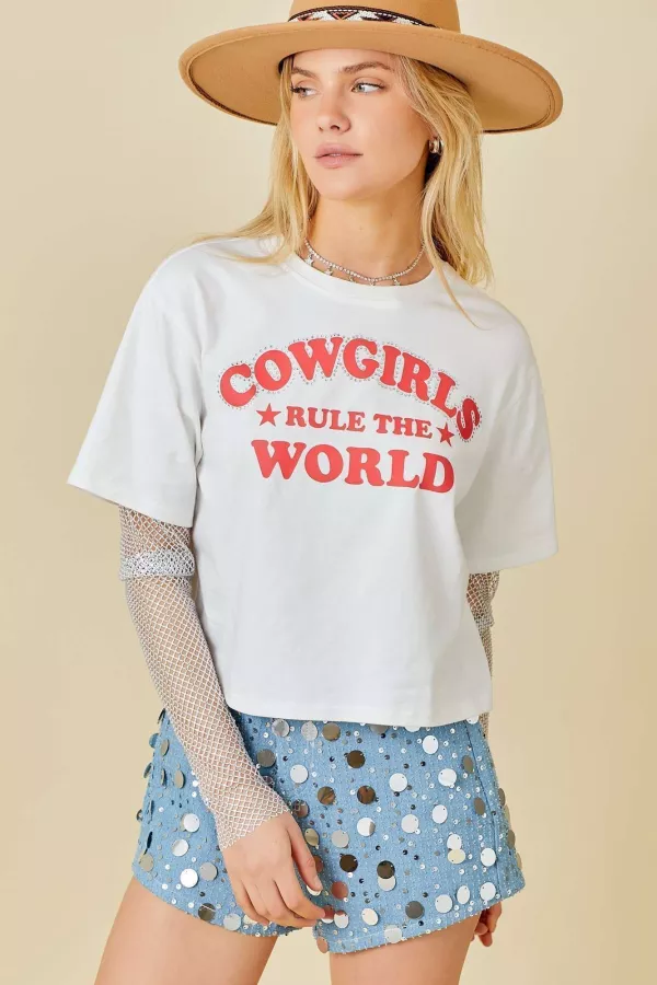 "COWGIRL" Rhinestone Embedded Graphic Tee Crop Top With Contrast Rhinestone Sleeve 65% COTTON 30% POLY 5%SPAN