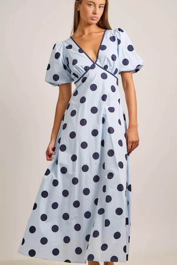 Deep V-neck Maxi Dress With Bubble Sleeves 100%cotton