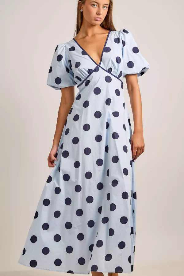 Deep V-neck Maxi Dress With Bubble Sleeves 100%cotton