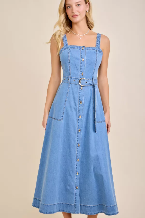 Elegant yet casual denim midi dress featuring gold button details and a matching belt. The structured fit flatters the waist while adjustable straps ensure comfort. Perfect for spring days, resort styling, and fall game day looks — pair with boots or heels for a chic Southern boutique outfit. denim midi dress, belted dress, gold button dress, game day dress, southern boutique apparel, spring resort, fall collection, casual chic, denim capsule, sleeveless dress, classic denim, belted waist, flattering fit, everyday outfit, resort to fall, chic denim, blue denim dress, feminine silhouette, structured bodice, boutique essential, timeless look, southern style, transitional dress, weekend outfit, midi length, main strip