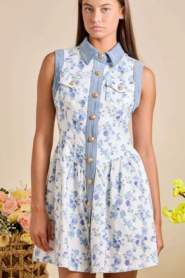 Freshen up your wardrobe with our Denim Floral Button-Front Dress. Sleeveless silhouette with structured denim bodice All-over delicate floral print skirt for a feminine touch Button-front closure with gold-tone hardware Chest pocket details and collared neckline for a chic finish Perfect for spring brunches, garden parties, or casual summer outings A versatile piece that transitions seamlessly into your Spring & Summer Capsule Collection.
