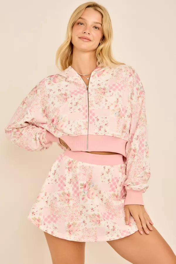 Ditsy floral patchwork printed cropped hoodie with matching set skort 50%COTTON 50%POLYESTER