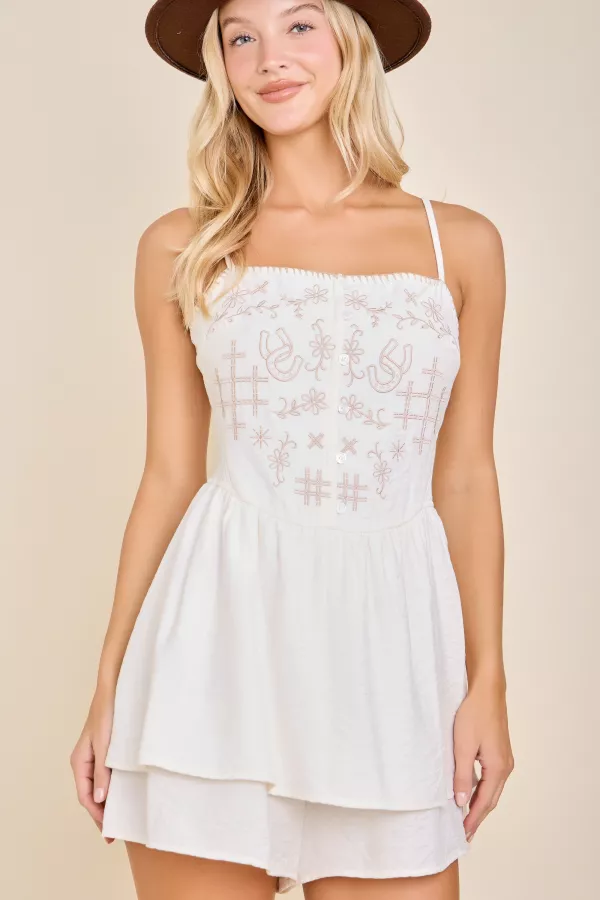 Feminine and playful, this embroidered skort romper features delicate floral stitching across the bodice and a layered skirt overlay for a flirty touch. The smocked back and adjustable straps ensure a comfortable fit, while the soft pink hue makes it perfect for spring and summer days. Ideal for brunch, vacations, or weekend outings. embroidered romper, sleeveless romper, layered skort romper, pink summer romper, floral embroidery outfit, feminine playsuit, cute casual romper, smocked back romper, tiered mini romper, spring summer look, girly style romper, resort outfit