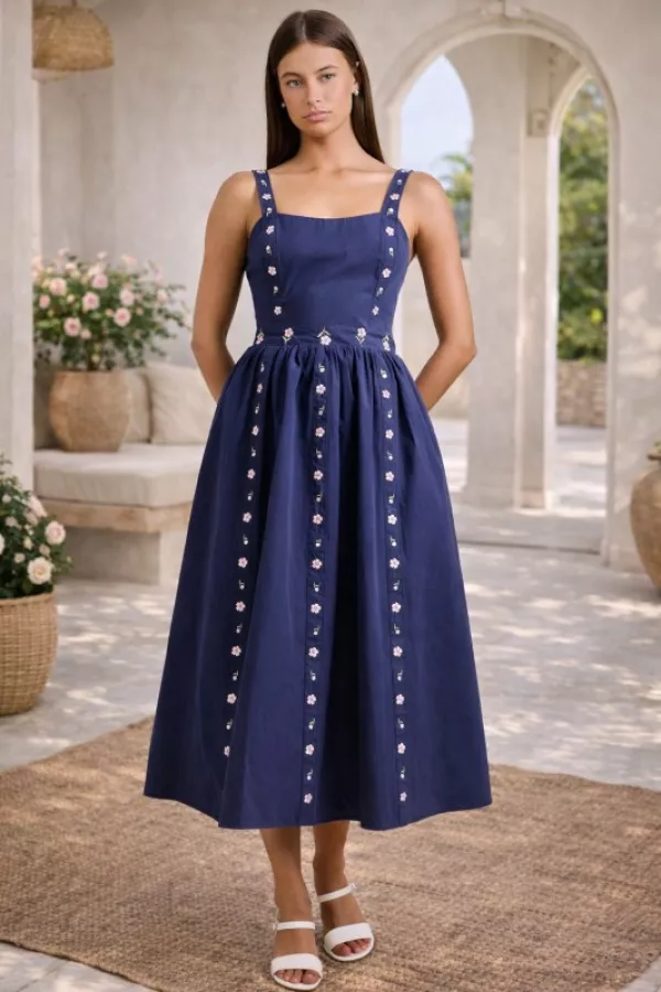 Step into effortless elegance with our Embroidered Strap Midi Dress, available in Navy and White. Square neckline with embroidered floral straps and panel accents Fitted bodice with a flowy A-line midi silhouette Lightweight cotton blend for breathable comfort Perfect balance of chic & feminine style Ideal for garden parties, brunch dates, summer weddings, or resort vacations A polished yet romantic piece to highlight your Spring & Summer Capsule Collection. embroidered strap midi dress, navy sundress, white summer dress, floral embroidered midi, spring wedding guest dress, chic vacation sundress, classic summer capsule fashion, elegant midi sundress, sleeveless embroidered dress, garden party outfit
