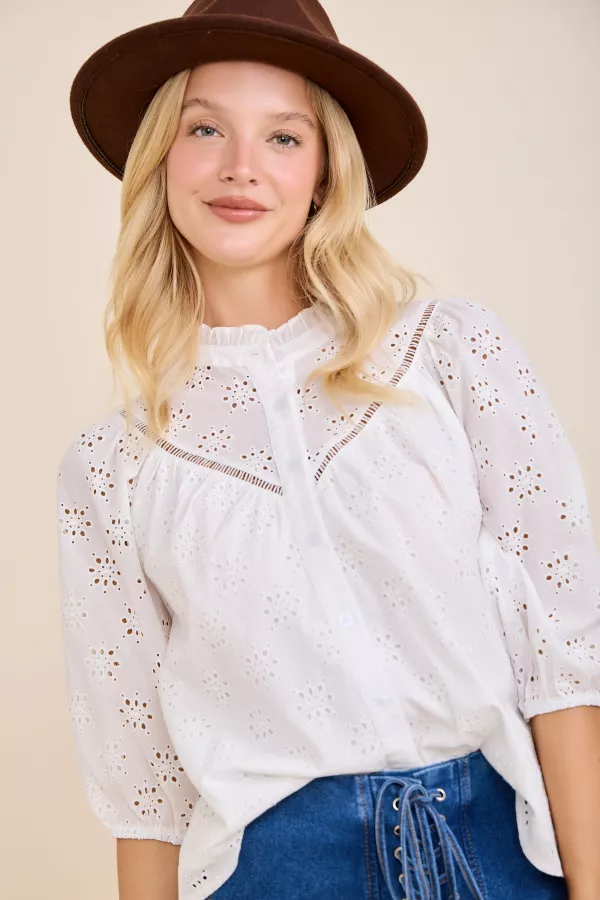 A charming eyelet embroidered blouse featuring a ruffle neckline and delicate yoke detail. The puff sleeves and scalloped hem add a feminine Western touch, perfect for spring days or layered looks. A must-have piece for Southern Boutique collections seeking effortless romance and charm. southern boutique apparel, western boutique style, eyelet blouse, embroidered white top, ruffle neck blouse, puff sleeve shirt, lace trim blouse, romantic western top, feminine spring blouse, prairie inspired look, southern charm style, boutique white blouse, coastal cowgirl outfit, vintage lace detail, boho romantic fashion, lightweight cotton blouse, chic western vibe, reformation inspired top, boutique essential, spring collection blouse