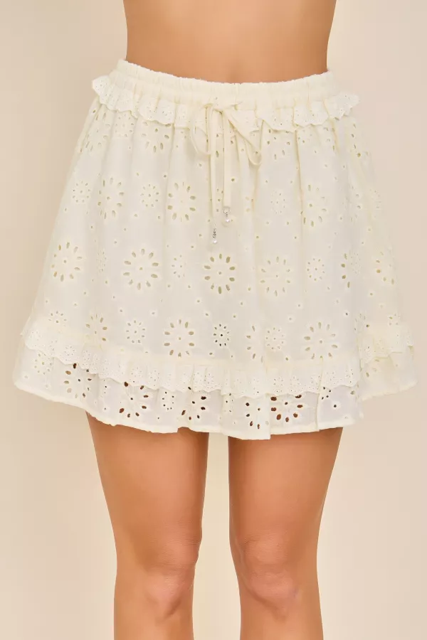 Feminine mini skort with floral eyelet embroidery, ruffle hem, and a comfortable elastic waistband with tie detail. Flowy, lightweight, and easy to style with tees, tanks, or the matching blouse for a complete spring outfit. eyelet skirt, mini skirt, ruffle skirt, embroidered skirt, spring bottom, floral eyelet, matching skirt, boutique favorite, resort outfit, Southern Boutique Apparel, ready to ship, ships fast, in-stock favorites, main strip Eyelet Floral Set – Embroidered Blouse & Ruffle Mini Skirt(MT34597 + MP81217)