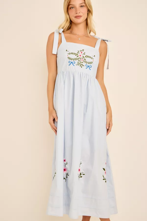 Romantic maxi dress featuring delicate floral embroidery on the bodice and hem, with feminine bow tie shoulder straps. Designed with a smocked back for a comfortable fit and flowy silhouette. Perfect for spring picnics, summer parties, or effortless everyday boho style. Embroidered maxi dress, Floral sundress, Boho summer dress, Tie strap dress, Smocked back maxi, Picnic dress, Resort wear, Cottage c ore dress, Vacation outfit, Garden party dress