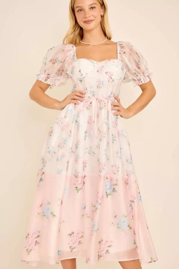 floral print colorblock midi dress with puff short sleeves 100%polyester