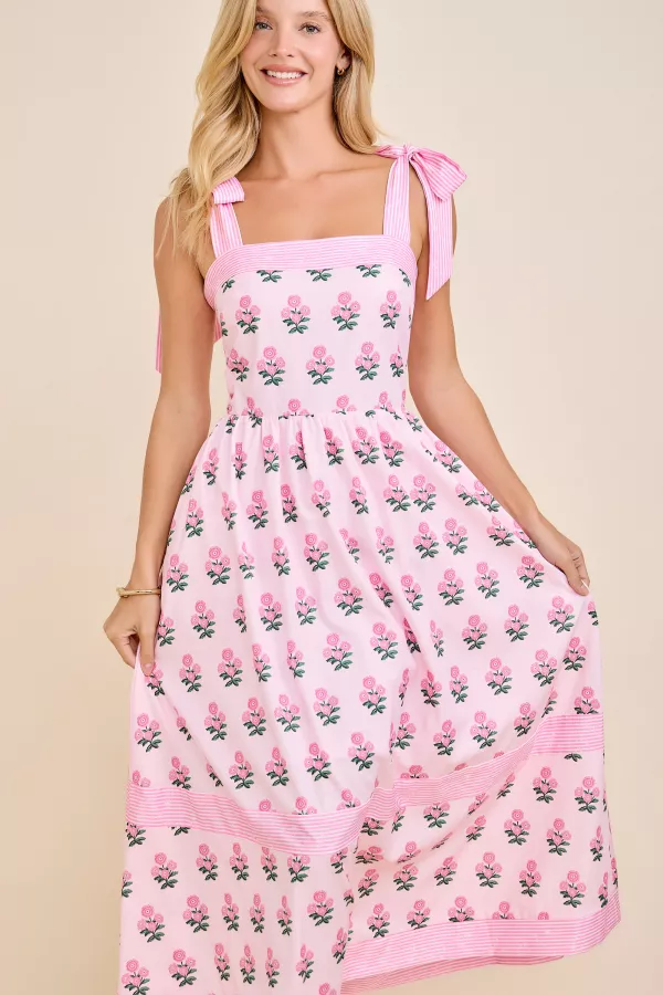 This charming midi dress features an allover floral print with delicate tie shoulder straps for a feminine touch. Smocked bodice offers a comfortable fit, while the flowy skirt with stripe panel details adds movement and style. Perfect for spring, summer, and vacation wear. floral midi dress, smocked bodice, tie strap dress, vacation outfit, casual summer dress, feminine sundress, garden party dress, resort wear, spring outfit, brunch style