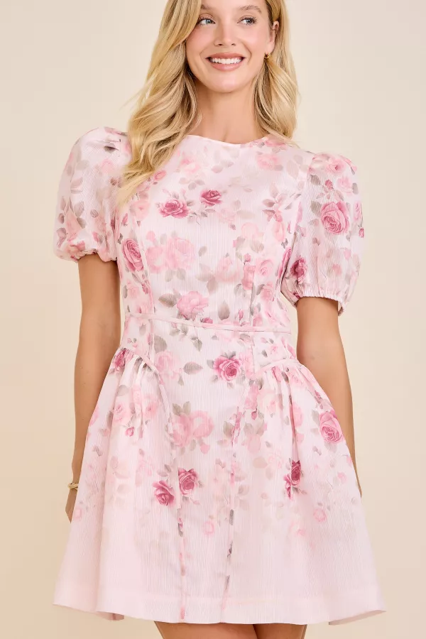 Romantic floral mini dress featuring puff sleeves, a fitted waist, and a softly flared skirt. Designed with feminine seam lines that enhance the silhouette for a flattering fit. Lightweight and elegant, perfect for brunch, garden parties, or seasonal events. floral dress, puff sleeve dress, romantic mini dress, feminine outfit, fit and flare dress, garden party dress, elegant floral print, spring summer dress, lightweight outfit, casual chic style