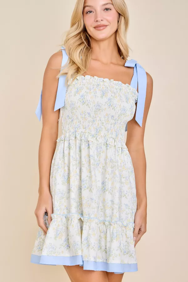 A sweet floral sundress featuring adjustable ribbon straps, a smocked bodice, and a soft ruffle hem for effortless spring charm. Light, feminine, and boutique-ready—perfect for picnics, weekends, and warm-weather styling. A must-have S/S 2026 piece for Southern boutique customers. floral sundress ribbon strap dress smocked floral dress ruffle hem dress spring summer dress boutique favorite Southern Boutique Apparel picnic dress vintage floral ready to ship ships fast in-stock favorites main strip