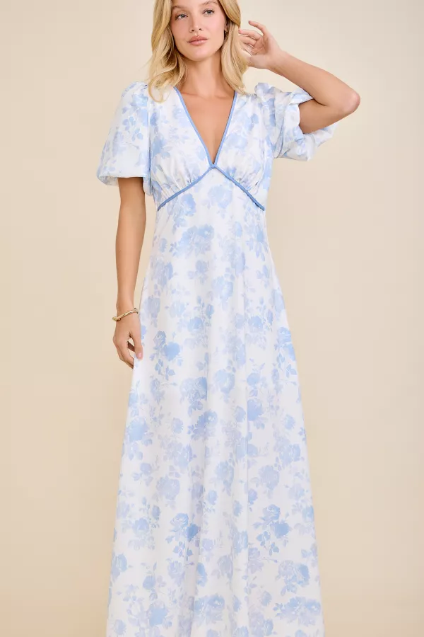 Elegant floral toile print maxi dress featuring soft bubble sleeves and contrast binding along the neckline for a refined touch. The flattering empire waist creates a romantic silhouette, while the lightweight fabric offers an effortless drape. Perfect for garden parties, picnics, or weekend getaways — timeless and feminine. floral maxi dress, toile print dress, bubble sleeve dress, contrast binding dress, feminine maxi dress, empire waist dress, romantic floral outfit, lightweight summer dress, garden party style, vintage inspired dress