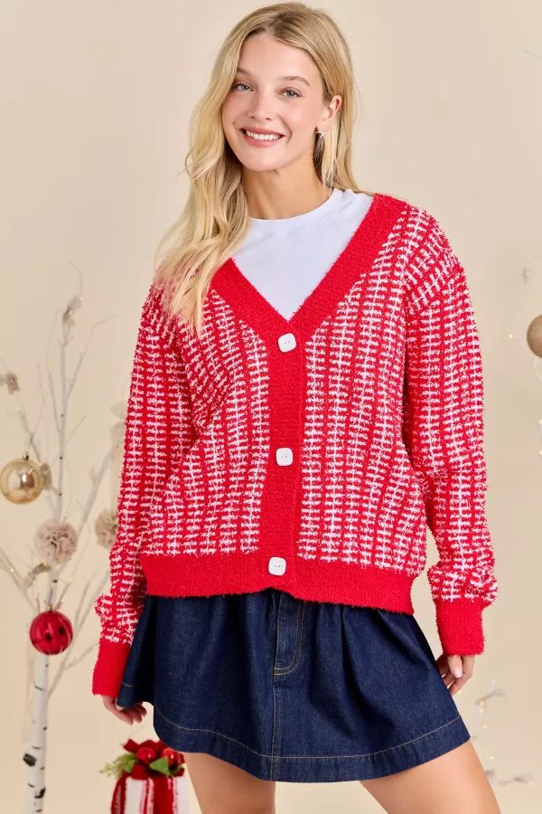 Add timeless charm to your winter wardrobe with this Holiday Red Check Knit Cardigan. Featuring a bold red & white check pattern, soft knit texture, and button-up front, this cardigan is perfect for layering over dresses, tops, or skirts. Designed for comfort and festive flair, it's an ideal choice for holiday gatherings, seasonal gifting, or creating cozy winter looks.