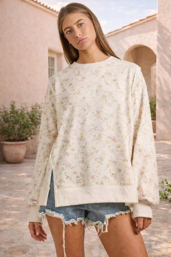 Fresh and feminine, this ivory sweatshirt is adorned with a subtle pastel floral print that captures spring's charm. Designed with a relaxed fit and side slits for easy movement, it blends comfort with effortless style. Soft fabric makes it perfect for casual outings, lounging, or pairing with denim and skirts. A versatile must-have to elevate your spring wardrobe with a romantic touch. ivory floral sweatshirt, spring pullover, pastel floral top, cozy floral loungewear, feminine casual outfit, side slit sweatshirt, romantic spring look, ivory layering piece, everyday floral pullover