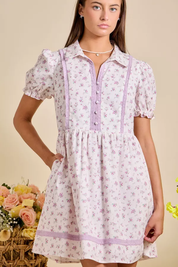 LACE DETAIL FLORAL PRINT SHIRT MINIDRESS 100%COTTON