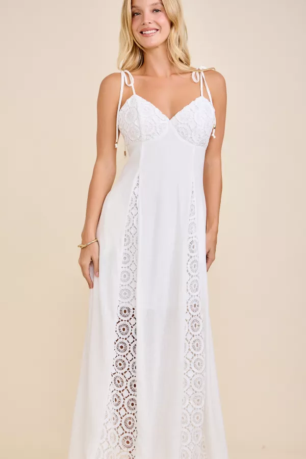 A romantic linen maxi dress featuring crochet lace inserts and adjustable tie straps. The fitted bust and flowy skirt create an elegant, effortless silhouette. Perfect for spring brunches, beach getaways, and resort boutique collections. lace dress, linen maxi dress, crochet lace, resort wear, feminine style, beach outfit, boutique apparel, white dress, spring collection, boho chic, vacation dress, romantic look, flowy silhouette, tie strap dress, Southern boutique apparel, lightweight fabric, resort chic, bridal shower, spring outfit, boutique fashion