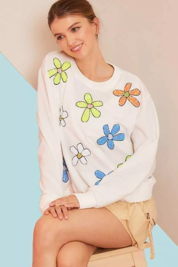 Round neck Long sleeve Sequin flower trim French terry Top 80% POLYESTER 15% COTTON 5% SPANDEX