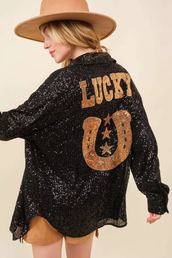 "LUCKY" Letter Print Sequin Shirt Top 100% POLY