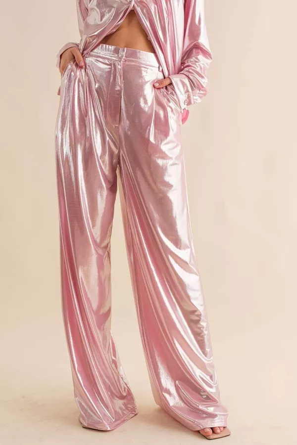 Elevate your glam style with these metallic wide-leg pants in pink and champagne. Designed with a relaxed yet chic fit, they shine under the lights and pair perfectly with the matching metallic button-up shirt for a stunning party-ready set. Metallic Pants, Wide-Leg Pants, Party Pants, Shiny Trousers, Festival Outfit, Holiday Pants, Pink Metallic, Champagne Metallic, Glam Bottoms, Matching Set -Product 1: Metallic Shirt(CP34170) Shiny Metallic Button-Up Shirt - Pink Stand out in this shiny metallic button-up shirt, available in pink and silver. Its relaxed fit and glossy finish make it perfect for parties, night-outs, or statement festival looks. Keywords: Metallic Shirt, Party Shirt, Shiny Top, Festival Outfit, Holiday Top, Silver Shirt, Pink Shirt, Clubwear
