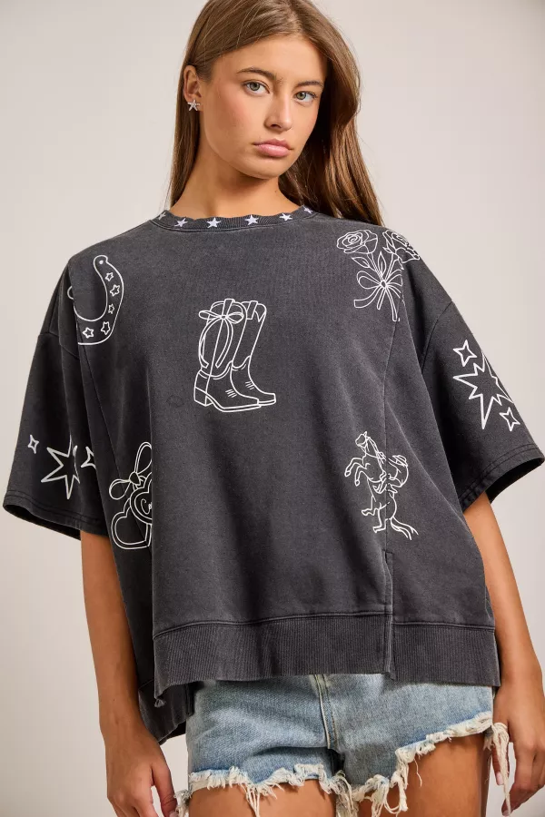 Mineral washed western printed oversized top with star embroidery neckline detail 50%COTTON 50%POLYESTER