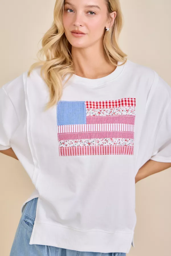 This oversized sweatshirt features a vintage-inspired Americana flag patchwork design. Made with a soft cotton-blend fabric, it offers an easy, relaxed fit that boutique customers love. Perfect for everyday casual wear, travel looks, game day outfits, and seasonal patriotic moments. Relaxed oversized fit Vintage patchwork flag detail Soft & comfortable for daily wear Easy to style with denim, shorts, or skirts Seasonless boutique staple Southern Boutique Apparel, Americana sweatshirt, patriotic patchwork top, USA flag sweatshirt, vintage inspired sweatshirt, oversized casual sweatshirt, boutique graphic top, game day outfit, holiday casual wear, everyday boutique style, main strip