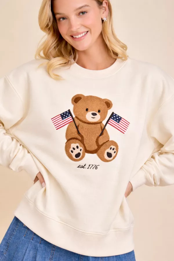 Soft and cozy sweatshirt featuring a textured teddy bear embroidery holding American flags with “est. 1776” detail. Designed with a relaxed fit, classic crew neckline, and ribbed trim for easy everyday wear. A charming Americana statement piece that feels playful yet boutique-ready — perfect for Memorial Day, 4th of July, fall transitions, and casual Southern boutique styling. Easy to pair with denim, leggings, or layered over shorts on cooler summer nights. teddy bear sweatshirt, patriotic sweatshirt, americana top, usa sweatshirt, southern boutique apparel, embroidered sweatshirt, casual fall top, 4th of july outfit, memorial day top, cozy graphic sweatshirt