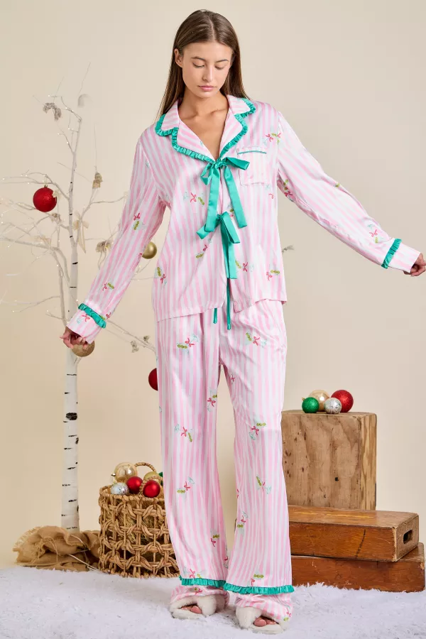 Add a festive and feminine touch to your holiday lounging with our Pink Stripe Christmas Pajama Set. Featuring pink-and-white stripes, holly print accents, and a satin bow neckline with ruffle trim, this cozy set is perfect for holiday mornings, seasonal gifting, or matching family looks. - Seasonal / Holiday Christmas Pajama Set Holiday Family Pajamas Festive Loungewear Holiday Matching PJs Cute Holiday Pajamas - Style / Detail Pink Stripe Pajama Set Satin Bow Pajamas Printed Christmas Sleepwear Women's Holiday Pajamas Cozy Holiday Sleepwear - Occasion / Fit Christmas Morning Outfit Holiday Gifting Pajamas Family Photos Pajama Set Matching Holiday Pajamas Seasonal Loungewear Capsule