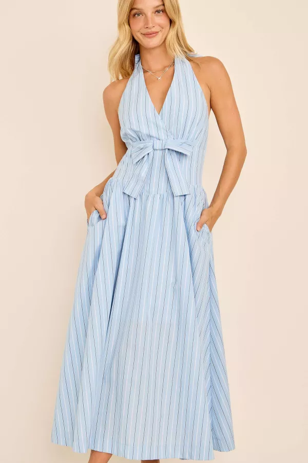 Feminine and fresh, this pink stripe halter midi dress features a flattering V-neckline, front bow detail, smocked back for comfort, and convenient side pockets. The flowy skirt adds movement and charm, making it perfect for spring outings, brunch dates, or resort getaways. Pink Stripe Dress Halter Midi Dress Bow Detail Dress Smocked Back Dress Resort Wear Spring Summer Outfit Casual Chic Dress Brunch Outfit