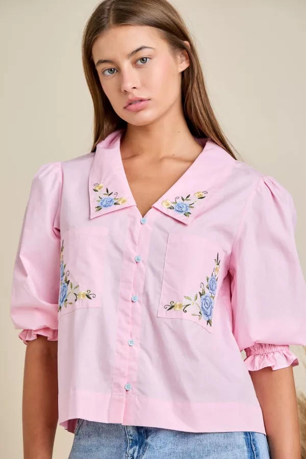 Romantic pink blouse featuring puff sleeves, floral embroidery on collar & pockets, and pastel blue buttons. Lightweight cotton blend offers comfort and charm. Perfect with jeans or skirts for a feminine spring look. Boutique favorite for gifting & everyday wear. Embroidered Floral Blouse, Pink Puff Sleeve Top, Romantic Pastel Shirt, Cottage core Style Blouse, Feminine Spring Top, Vintage Inspired Embroidery, Cute Girly Blouse, Boutique Women’s Top