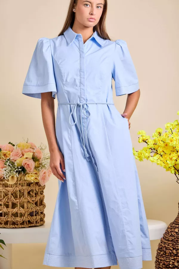 Elevate your everyday style with our Puff Sleeve Shirt Dress, available in Blue and White. Collared button-front design with tie waist detail Puff sleeves for a modern, feminine silhouette Midi length with clean tailored finish Lightweight cotton blend for breathable comfort Perfect for brunch dates, office chic, casual weekends, or vacation wear A versatile piece that blends elegance and comfort in your Spring & Summer Capsule Collection. puff sleeve shirt dress, blue summer dress, white midi dress, collared button front dress, waist tie midi dress, everyday chic outfit, capsule summer fashion, modern feminine dress, casual workwear dress, lightweight cotton sundress