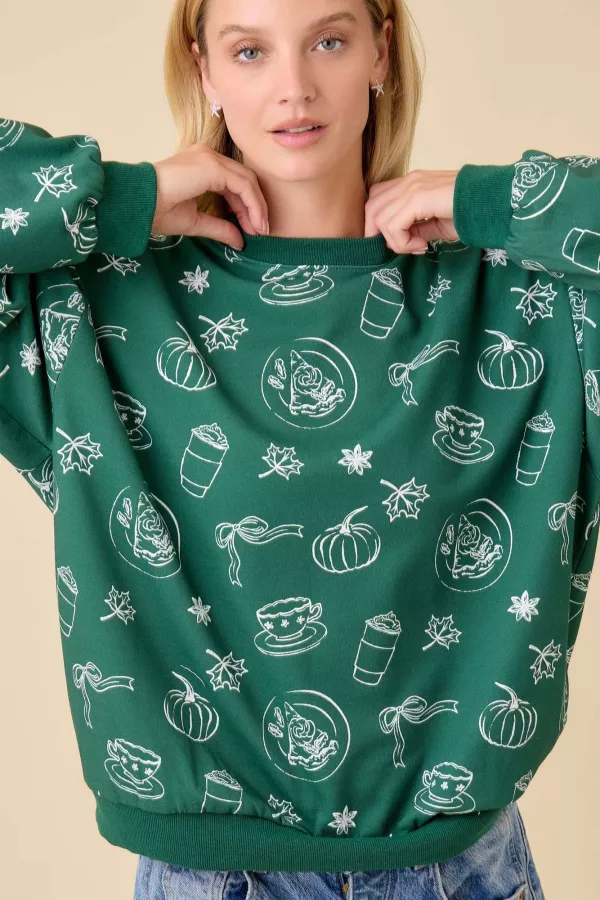 -Seasonal / Holiday Pumpkin Spice Sweater Thanksgiving Outfit Top Holiday Cozy Knitwear Autumn Print Pullover Fall Festival Sweater -Style / Detail Green Patterned Knit Sweater All Over Print Pullover Coffee Cup Motif Sweater Cute Fall Knit Top Oversized Holiday Sweater - Color / Fit Deep Green Knit Sweater Relaxed Fit Pullover Crew Neck Knit Top Lightweight Cozy Knit Festive Fall Outfit