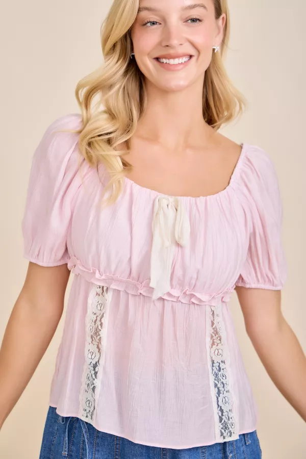 Sweet and feminine, this peasant blouse features a soft pink body with lace inset panels and a bow tie neckline. The elastic waist and puff sleeves add shape and comfort. Lightweight cotton blend fabric makes it perfect for spring picnics and summer dates. romantic blouse, lace ribbon top, cottagecore shirt, puff sleeve blouse, peasant top, pink spring blouse, Main Strip top, feminine spring outfit Styling Tip Pair with denim skirts or white trousers for a soft romantic look, or layer under a knit vest for an easy cottagecore outfit.