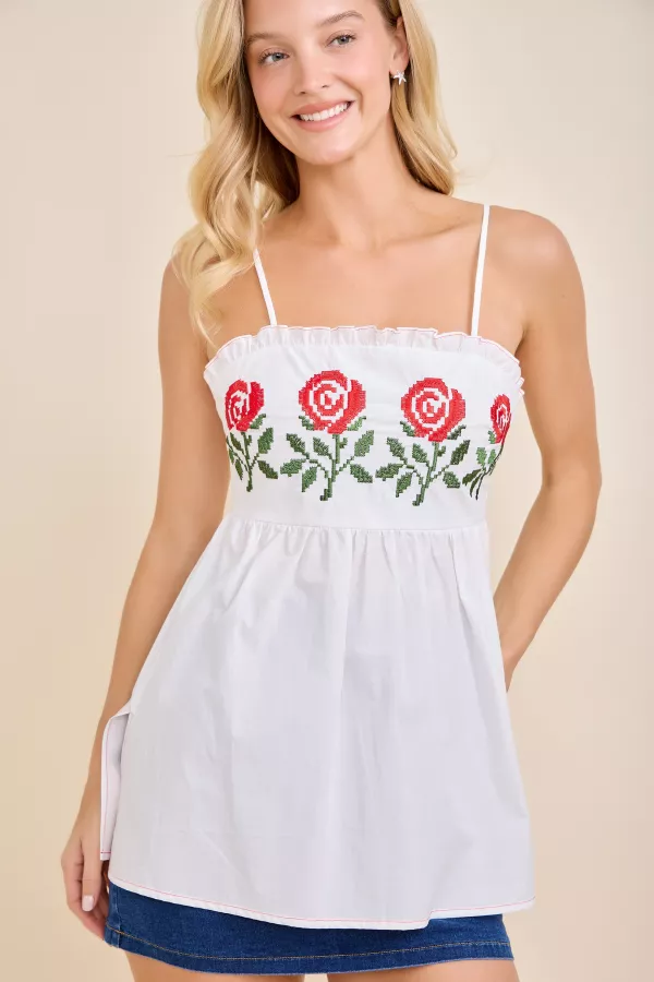 A romantic babydoll camisole featuring bold rose embroidery and delicate ruffle trim. Adjustable straps and a tie-back detail create a flattering, easy fit, while the flowy silhouette adds feminine charm. Perfect for spring styling, festivals, and boutique collections. Ready to ship • Ships fast • In-stock favorites rose embroidered top, floral cami, babydoll camisole, ruffle cami top, embroidered blouse, spring festival top, boho floral top, boutique tops, adjustable strap cami, romantic embroidered top, ready to ship, ships fast, in-stock favorites