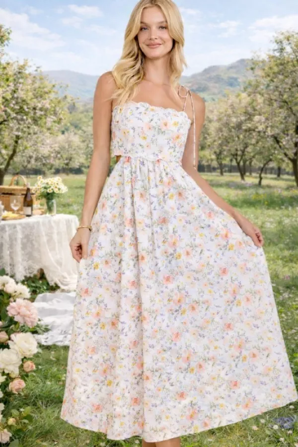 Charming floral midi dress featuring an embroidered scallop edge neckline and adjustable tie shoulder straps. The smocked back ensures a flattering, comfortable fit, while the flowy gathered skirt adds a romantic silhouette. Perfect for brunch, picnics, or sunny getaways — feminine and effortlessly chic. floral midi dress, embroidered scallop dress, tie shoulder dress, sleeveless midi dress, smocked back dress, romantic summer dress, feminine outfit, floral sundress, lightweight vacation dress, garden party style
