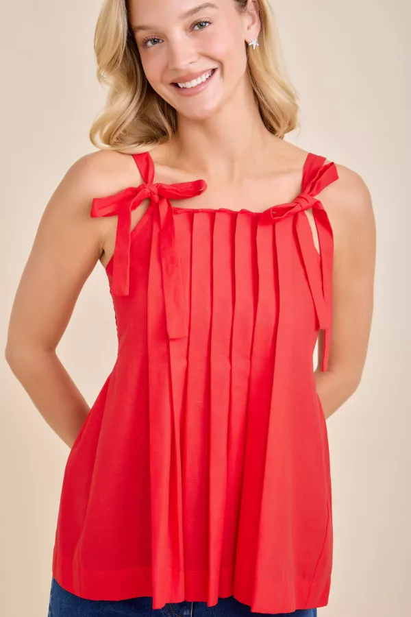 This feminine sleeveless top features delicate front pleating and adjustable ribbon tie straps for a soft, flattering fit. Lightweight and flowy, it’s perfect for warm-weather days, date nights, vacations, and everyday boutique styling. A standout piece that pairs beautifully with denim, shorts, or skirts for an effortlessly charming look. red sleeveless top, ribbon strap top, pleated front top, summer boutique top, feminine top, date night outfit, vacation outfit, Southern Boutique Apparel, spring summer top, Main Strip Apparel