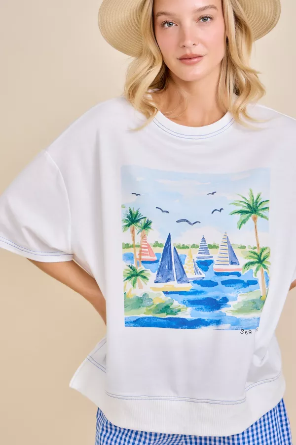 A relaxed-fit coastal graphic top featuring a hand-painted sailboat and seaside scene. Designed with a soft feel and easy silhouette, this style pairs perfectly with denim, linen pants, or resort-ready skirts. A versatile Southern boutique favorite for spring, summer, and coastal displays. Coastal graphic top, sailboat print top, sea breeze top, Southern boutique apparel, resort style top, relaxed fit graphic tee, coastal boutique favorite, summer graphic top, vacation wear, easy everyday top, main strip