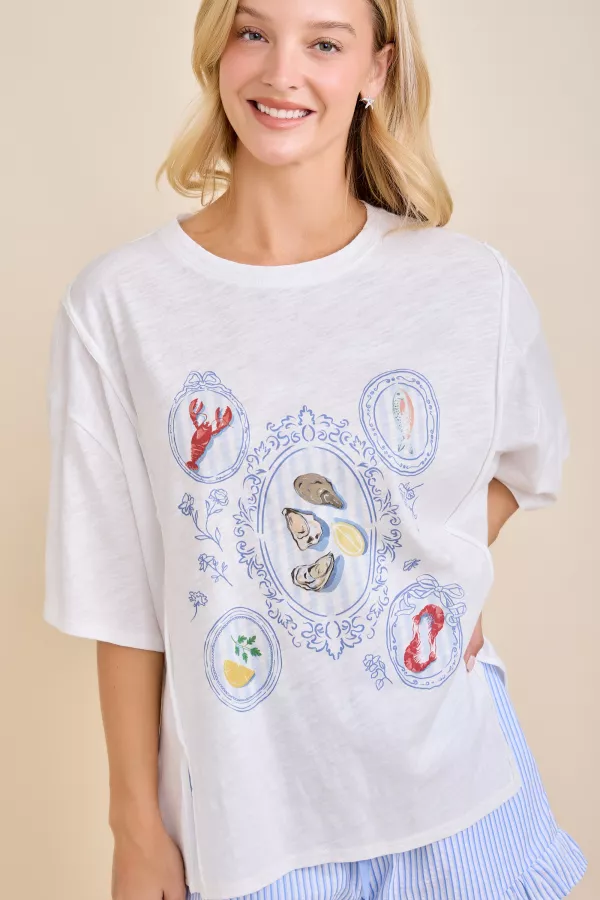 Relaxed-fit short sleeve tee featuring a playful seafood plate illustration graphic with a vintage-inspired frame detail. Lightweight and breathable with an easy, everyday silhouette. Finished with a side slit hem for comfort and effortless styling—perfect for casual boutique looks, spring/summer drops, and resort-inspired merchandising. Short sleeve graphic tee Seafood plate illustration print (lobster, fish, oysters, lemon) Relaxed, easy fit Lightweight & breathable feel Side slit hem detail Easy everyday / resort-casual styling graphic tee, seafood graphic, coastal tee, resort casual, summer tee, relaxed fit tee, casual boutique top, foodie tee, nautical vibe, vacation top