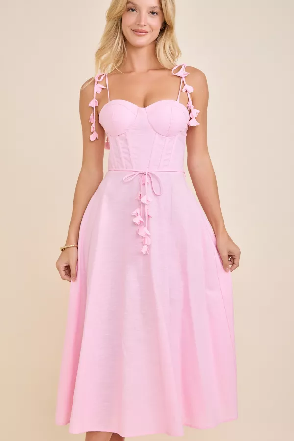 Bra Cup Self Tie Shoulder Strap With Floral Trim Back Smoking Zipper Waist Self Tie Belt Flare Midi Dress 55% COTTON 45% LINEN