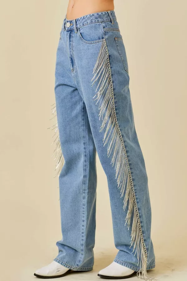 Waist Belt Loop Button And Zipper Back And Side Rhinestone Fringe Trim Denim Pants MATCHING SET #LT33815 65% COTTON 34% POLY 1% SPAN