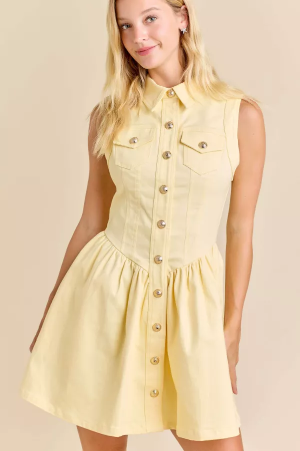 A playful twist on the classic denim shirt dress. This sleeveless mini dress features a button-front design, collared neckline, and fitted waist with a flared hem for a flattering silhouette. Perfect for layering or wearing solo, it's a versatile style for spring through fall. denim shirt dress, sleeveless denim dress, button front mini dress, casual denim dress, flare hem shirt dress, western chic dress, boutique summer dress