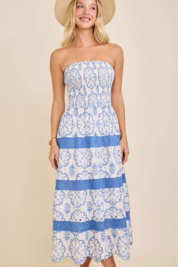 This strapless midi dress features a smocked bodice for a flattering, comfortable fit and tiered embroidered panels that add texture and movement. The rich blue floral patterns create a coastal-inspired charm, perfect for sunny getaways, brunches, or summer strolls. Effortlessly chic with a bohemian touch. smocked midi dress, strapless embroidered dress, tiered summer dress, blue white boho dress, coastal resort dress, feminine midi outfit, vacation style dress, strapless boho look, embroidered floral midi, flowy sundress, bohemian chic dress, summer casual dress